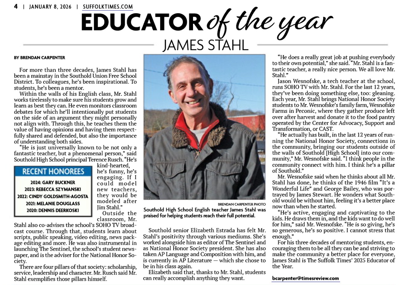Please join in congratulating our very own Mr. James Stahl on receiving the Suffolk Times' 2025 Educator of the Year award!